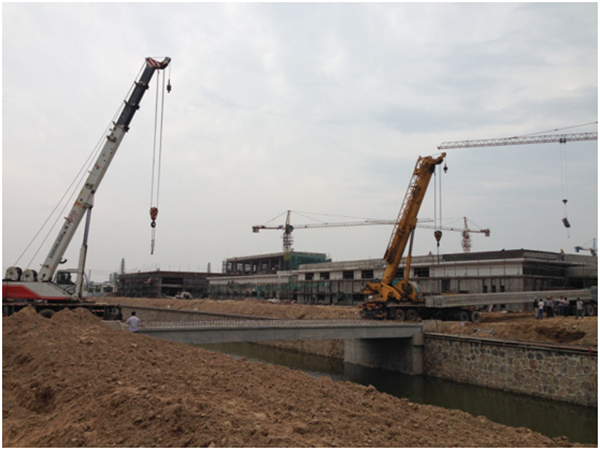 近日,在開發(fā)公司的積極推進下,可發(fā)科技廠區(qū)內(nèi)4座橋梁中的2#橋單跨20m空心梁板正式開始吊裝。