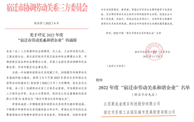 近日,園區(qū)城發(fā)公司獲評2022年度“宿遷市勞動(dòng)關(guān)系和諧企業(yè)” 榮譽(yù)稱號。