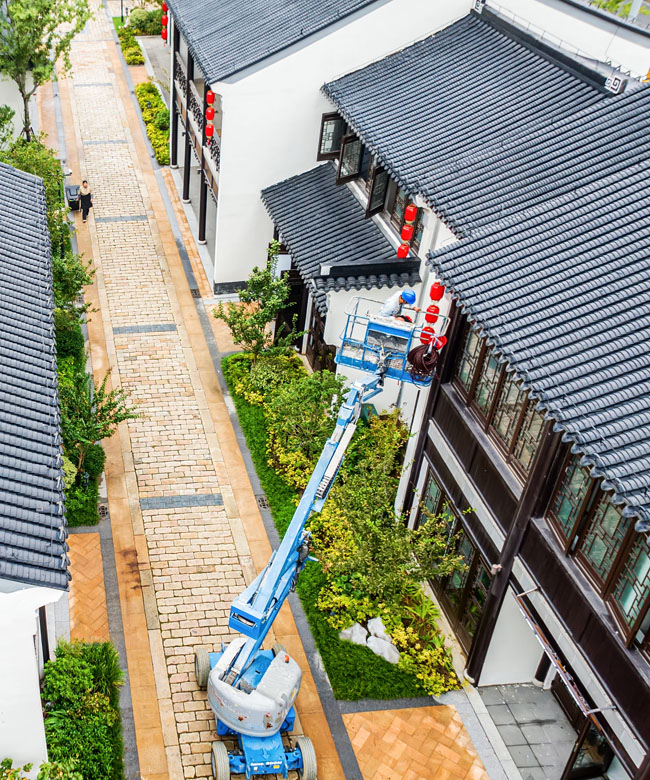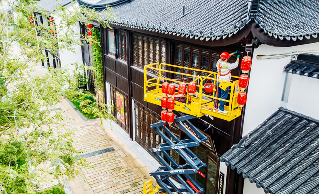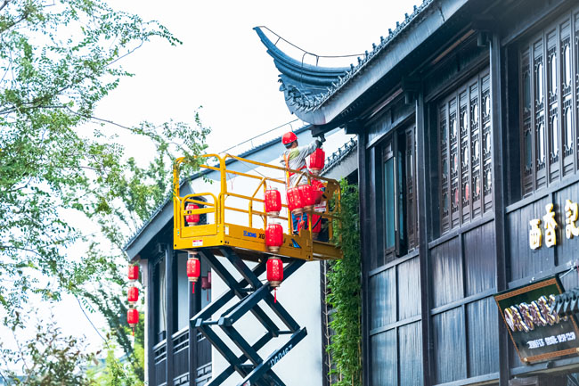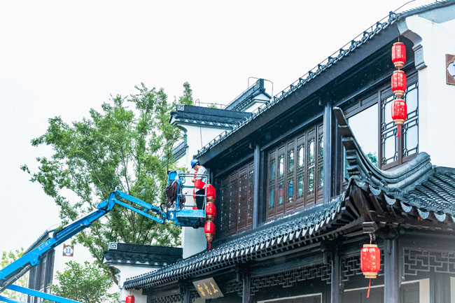 2023年9月25日,蘇宿工業(yè)園區(qū)蘇州街,工人們正在掛燈籠,喜迎中秋、國慶雙節(jié)到來。大紅燈籠與白墻青瓦綠樹相映成趣,成為一道靚麗的風景線,營造了歡樂、喜慶、祥和的節(jié)日氛圍。
