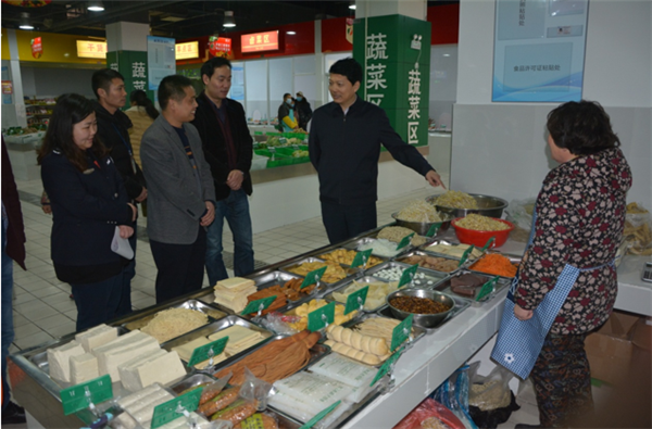 戈亮一行現(xiàn)場聽取了菜場負(fù)責(zé)人開業(yè)準(zhǔn)備工作情況匯報,實地察看了生鮮菜場規(guī)劃布局、開業(yè)方案、食品安全臺賬、食品安全檢測室設(shè)備,與各經(jīng)營戶親切交談。
